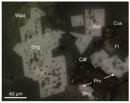 Sharyginite crystals with characteristic yellowish brown internal reflections from the Bellerberg volcano. Reflected light, crossed polarizers. Cal—calcite; Cus—cuspidine; Fl—fluorite; Prv—perovskite; Shg—sharyginite; Wad—wadalite.