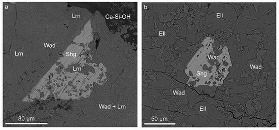 (a) Sharyginite crystal in larnite-wadalite rock from the Upper Chegem volcanic Caldera; (b) Poikilitic euhedral crystal of sharyginite with wadalite inclusions. BSE images. Ca-Si-OH—Ca-hydrosilicates, Ell—fluorellestadite, Lrn—larnite, Shg—sharyginite, Wad—wadalite.