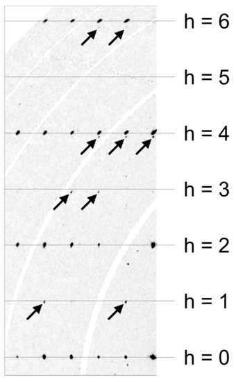Reconstruction of the reciprocal space layer hk0 of a crystal affected by 90° rotation twinning. Arrows point to reflections belonging to the smaller twin individual. Synchrotron diffraction data. The curved white bands are caused by gaps between the elements of the Pilatus 2M-F detector and contain no measured data.