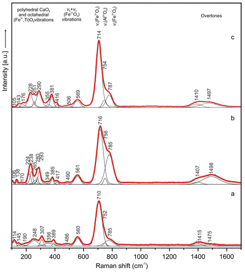 In the Raman spectrum of the holotype sharyginite the following main bands were noted (cm−1) (Figure 9a): 114, 145, 190, 248, 307, 389, 486, 560, 710, 752, 785 and 1415, 1475 (overtone). Bands in the OH region were not observed. The spectrum of sharyginite was dominated by an intense Raman band at 710 cm−1 which was attributed to ν1 (Fe3+O4) tetrahedra symmetric stretching vibrations. Two shoulders observed on this band with relative lower intensity at 752 and 785 cm−1 were associated with ν1 (AlO4) and ν3 (Fe3+O4) modes, respectively. Bands at 486 and 560 cm−1 were related to tetrahedral bending vibrations of (Fe3+O4) group. The low wavenumber region below 400 cm−1 was ascribed to the polyhedral CaO8 and octahedral (Fe3+, Ti)O6 vibrations [1]. Raman spectra of sharyginite from the other two localities (Figure 9b,c) were similar to the sharyginite spectrum from the Bellerberg. The Raman spectrum was also similar to that of shulamitite [1], with the main distinction in the position of the main band.