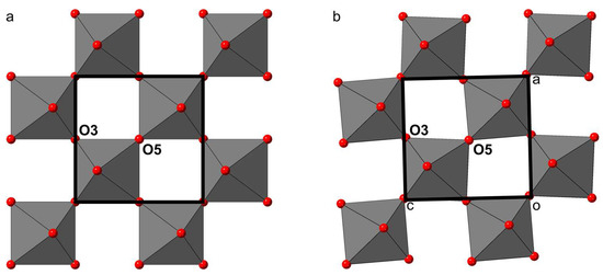 At a first glance, the main structural differences between shulamitite and sharyginite appear to be in tetrahedral layers: shulamitite exhibits disorder of two possible configurations of the tetrahedral chain, whereas in sharyginite, only one type of chain exists, which also results in the structure being acentric. Looking more closely, another striking difference can be noted in the octahedral layers: Figure 10 shows a view perpendicular to the octahedral layers of both structures. In shulamitite (Pmma), the oxygen atoms O3 and O5 reside on the two-fold axis 2[010]. As a consequence, the octahedra cannot be rotated around the b-axis, as their O3-O5 edges are constrained to be parallel to a and c (Figure 10a). The lower symmetry in sharyginite (P21ma) does not restrict O3 and O5 on a special position, thus allowing the octahedra to rotate around b. The rotation, which can be seen in Figure 10b, is 3.15°. The reason for this rotation is most likely an adaption to the configuration of the tetrahedral chains. As discussed earlier [44], the tetrahedral chains exhibit a dipole moment. In shulamitite, all chains are disordered, resulting in a net dipole moment of zero. Only one type of chain occurs in sharyginite, therefore dipole moments have to be compensated by distortions of the octahedral layers and displacement of Ca cations.