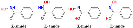 - Adiguzel, E.; Yilmaz, F.; Emirik, M.; Ozil, M. Synthesis and characterization of two new hydroxamic acids derivatives and their metal complexes. An investigation on the keto/enol, E/Z and hydroxamate/hydroximate forms. J. Mol. Struct. 2017, 1127, 403–412. [Google Scholar] [CrossRef]