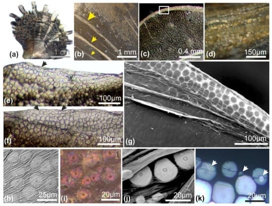 Pinctada margaritifera: discoid mineralized structures on the internal side of the periostracum. (a) Scaly aspect of the shell due to the series of back-and-forth movements of the mantle. (b,c) Remains of the periostracum on the outer surface of the shell. (d) Enlarged view of a periostracal remain: note the presence of the polarizing disks in the enrolled membrane. (e,f) Flat growing edge of the shell showing the round shaped disks at the forefront. (g) SEM view of an equivalent area. (h–k) Different equivalent views of the periostracal disks at the growing edge of the shell growth lamella. (h) Disks and central nodule viewed by SEM outer surface of the periostracum. (i) Optical microscopy (polarized episcopy). (j) SEM view of the folded periostracum showing the different growth statuses of the disks. (k) Equivalent area in transmitted polarized light. Note that the young disks (arrows) are apparently superposed to the older ones, due to periostracum folding. Credit pictures: (g,j) [].
