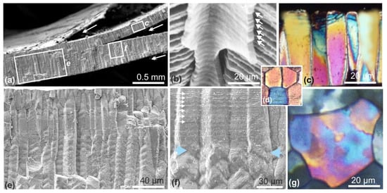 Figure 6a, obtained by polarization microscopy (transmitted light), provides us with colorful evidence of what occurs at the shell growing edge during the early stages of the prismatic layer formation. At the upper part of the view, the front line of the prismatic units exhibits slightly different grey colors, corresponding to a thickness of 3–4 µm of the calcite units, with distinct crystallographic orientations. The SEM view of the same area (Figure 6b,c) reveals their early developmental steps. The first occurrence of the Marsh membrane is visible on the inner side of the polygonal units, whereas on its outer side the regularly spaced lines illustrate the pulsed growth mode of the periostracum.
