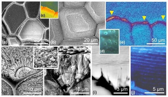 Rare observations (e.g., [,]) had already shown that a granular structure of the mineral phase can be observed within some fossil samples. A series of secondary electron microscopy (SEM) views of growing surfaces and internal structures found in Pinna prisms (the reference model for biocrystals since Bowerbank [] and Carpenter [,]) provided evidence of an unexpected fine structure and mode of growth, quite different from the structural patterns of a chemically produced crystal [,,,] (Figure 1c,d).