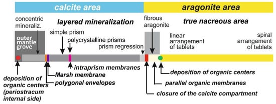 Starting with the initial deposition of organic nodules in the deeper part of the outer mantle grove and ending with the remarkably controlled arrangement of the nacreous tablets in the most internal areas, this overview of Pinctada shell development can be summarized in Figure 10. Attention is drawn to the series of metabolic events that lead to the formation of this shell, which is the typical representative of the “prismatic/nacreous” model, frequently used as a general model for calcification in Bivalves.