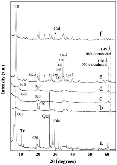 - Brindley, G.W.; Brown, G. X-ray diffraction procedures for clay mineral identification. In Crystal Structures of Clay Minerals and Their X-Ray Identification; Brindley, G.W., Brown, G., Eds.; Mineralogical Society: London, UK, 1980; pp. 305–356. ISBN 9780903056373. [Google Scholar]