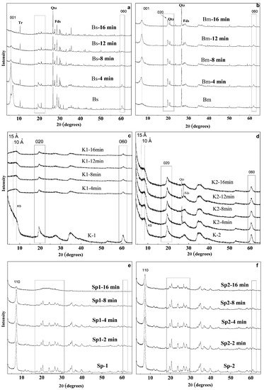 Different behaviour may also be observed in the case of the sepiolite samples Sp1 and Sp2 (Figure 2e,f). The comparison of the X-ray diffraction profiles of the Sp1 sample and the acid-activated materials shows that the microwave-assisted acid treatment causes a progressive decrease of the original diffraction reflections, which is more evident after 8 min of treatment. From this time of treatment, the 110 reflection of Sp1 decreases considerably, remaining a negligible shoulder at 16 min. Figure 2e also shows that reflections located between 20 and 40° 2θ broaden and decrease in intensity with the treatment time, while a broad band appears instead between 20 and 30° 2θ. This result suggests the appearance of an amorphous phase whose proportion increases with the progressive disappearance of sepiolite [39].