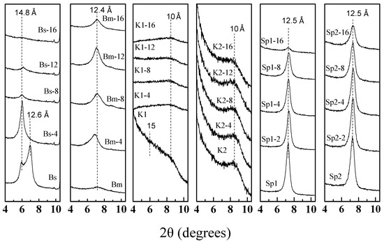 Figure 2c,d shows the XRD patterns of kerolite/stevensite mixed layer samples (K1 and K2) and the obtained materials after 4, 8, 12 and 16 min of microwave-assisted acid treatments. In the K1 sample, the acid treatments cause a general decrease of the diffraction reflections, especially the basal one (near 15 Å), a small reflection remaining at 10 Å (Figure 3). On the other hand, the K2 sample (Figure 2d), mainly formed by kerolite (80% in the mixed layer) [5] presents a resistance to acid treatments notably higher than those observed in the K1 sample. In this case, it was observed that in general, most of the diffraction reflections maintain their intensity in the first 12 min of treatment but a slight decrease at 16 min is observed. These results suggest that MAT treatment causes the loss of the stevensite layers (15 Å) [40] in the stacking sequence of the mixed layers, whereas the kerolite layers remain unchanged [5].