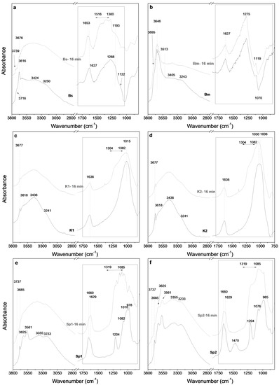 Figure 4a,b shows the FTIR spectra of the starting smectite samples (Bs and Bm) and the material obtained after 16 min of MAT. The OH stretching region (between 3800 and 2800 cm−1) of the Bs sample displays an intense peak at 3676 cm−1 accompanied by a weak shoulder at 3716 cm−1, and a broad band centred at 3616 cm−1. The band at 3676 cm−1 is related to the OH stretching mode of structural Mg(OH)2 groups in the octahedral sheet of saponite and stevensite structure [50,51]. The band at 3716 cm−1 is assigned to the νOH of isolated Si–OH groups located on the external surface of laminar particles [52], whereas the band at 3616 cm−1 is related to the OH stretching modes of Al(OH)Si groups formed by isomorphic substitutions of Si(IV) by Al(III) in the tetrahedral sheet of saponite [53,54].