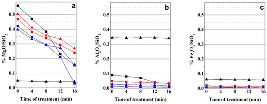 Table 1 shows the chemical analysis of starting samples and obtained materials after 16 min of MAT, whereas the variation of MgO/SiO2, Al2O3/SiO2 and Fe2O3/SiO2 weight ratios of chemical composition of the materials obtained through the microwave-assisted acid treatment are shown in Figure 5. This graph corroborates the different behaviour of smectites with the microwave-assisted acid treatment according to the composition of the octahedral sheet. An intense dissolution of Mg2+ ions of the octahedral sheet in the trioctahedral smectite (Bs) is observed. In this case, the dissolution of 32% of Mg2+ of octahedral sheet occurs in the first 8 min of treatment and an additional 45.2% is lost at 16 min of treatment. In the case of dioctahedral smectite (Bm), the amount of this element in the octahedral sheet is notably smaller compared with that of the Bs sample (Figure 5a), and the loss of Mg2+ is notably smaller; 12% in the first 8 min and an additional 2% at 16 min.