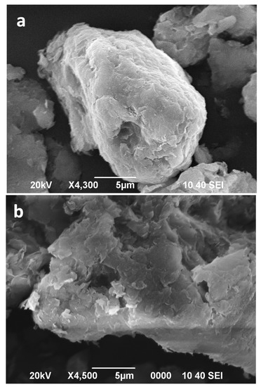 SEM images of Bm (a), Bm after 16 min of microwave-assisted acid treatment (b).