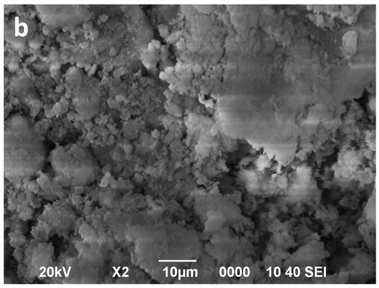 Figure 8 and Figure 9 also show SEM micrographs of the 16-min acid-activated K1 and K2 samples. A detailed comparison of Figure 8a,b suggests that no significant decrease in the size of the porous aggregates occurs after 16 min of MAT. However, some textural changes in the external surface of aggregates suggest changes in their porosity. On the contrary, the comparison of Figure 9a,b suggests a slight decrease in the size of the porous aggregates of K2 sample. Nevertheless, the proportion of clay-sized particles (<2 µm) appears to be unchanged during the treatment in both K1 and K2 samples.
