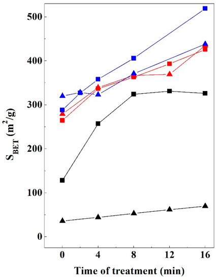 On the contrary, in the 8- and 16-min-treated sepiolite samples, in general the Stmicro and SBET values are notably higher when these samples are degassed at 200 °C. This result suggests that the SSA values of these treated sepiolite samples are not affected by any structural transformation. In acid-treated sepiolite, a higher temperature allows the complete degassing of the sample and therefore the obtaining of SSA values closer to reality [39].