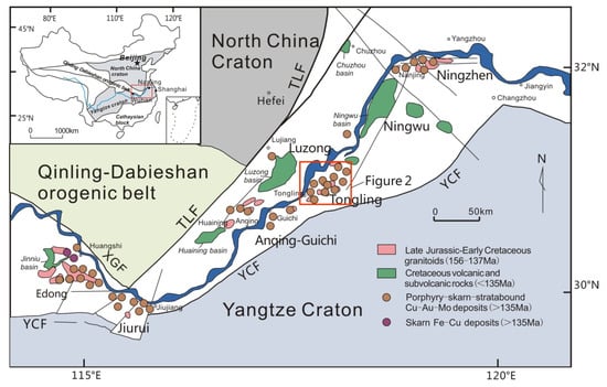 Geological map showing the location of the Tongling ore district, and related porphyry–skarn–stratabound Cu-Au-Mo (>135 Ma) deposits along the Middle–Lower Yangtze River Valley Metallogenic Belt []. Faults: TLF—Tancheng–Lujiang fault, XGF—Xiangfan–Guangji fault, YCF—Yangxing–Changzhou fault.