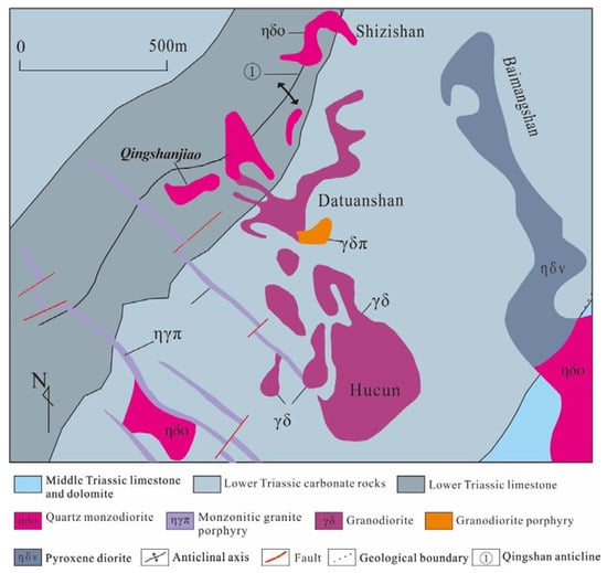 The Dongguashan copper (gold) ore deposit is situated at the intersection of the EW-trending Tongling–Shatanjiao tectonic–magmatic belt and the Qingshan anticline of the NE-trending Shun’an synclinorium [,] (Figure 2 and Figure 3). The mineralization is mainly related to the siliceous and argillaceous hornfels of the Upper Devonian Wutong Formation, impure carbonate of the Middle to Upper Carboniferous Chuanshan and Huanglong formations, and bioclastic limestone and skarn of the Lower Permian Qixia Formation. There are NE-trending folds and SN-, EW- and NNE-trending faults in the Dongguashan deposit. The NE-trending Qingshan anticline and the associated interformational fracture zones between the Carboniferous and Devonian strata are the most important ore-controlling structures in this area. The complex structure network in this area provides channels for the ascent and emplacement of magma during the Yanshanian period. The Qingshanjiao quartz monzodiorite is closely related to the mineralization in the Dongguashan deposit [].