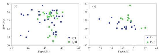 In general, hydrothermal pyrite is depleted in sulfur, and sedimentary pyrite is rich in sulfur or close to its theoretical value []. The S/Fe atomic ratio values of Py I and Py II in the Dongguashan deposit are 1.87–2.05 and 1.85–2.00, with corresponding average values of 1.97 and 1.95 (Appendix A), respectively, thus showing sulfur-deficient characteristics [,,]. This observation suggests that both Py I and Py II are hydrothermal-origin pyrite. The Co and Ni contents in pyrite and pyrrhotite can reflect the origin of pyrite, as well as its ore genesis and geological setting [,,]. The Co/Ni ratios of sedimentary pyrite and magmatic–hydrothermal pyrite have values of Co/Ni < 1 and Co/Ni > 1, respectively [,,,]. The Co/Ni ratios of Py I, Py II, Po I and Po II are 0.50–48.00, 4.00–45.00, 1.55–14.45 and 1.02–1.36, respectively (Appendix A). The As/Au ratios of Py I and Py II are 0.13–20.50 and 0.20–20.33, respectively. The Sb/Au ratios of Py I and Py II are 0.07–6.14 and 0.08–0.67, respectively (Appendix A). As/Au and Sb/Au ratios are less than those of sedimentary pyrite (As/Au > 200, Sb/Au > 100, [,]). Most of the Co/Ni ratios are greater than 1 and vary widely, which are consistent with the characteristics of pyrite with a magmatic–hydrothermal origin [].