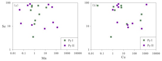 Py I and Py II have only minor geochemical differences. Py I records wide ranges of Cu (0.04–461.81 ppm, average: 79.65 ppm), Mn (0.46–12.48 ppm, average: 2.46 ppm), Zn (1.04–15.83 ppm, average: 7.42 ppm) and Se (3.49–75.77 ppm, average: 41.80 ppm), and narrow ranges of Sn (0.14–0.54 ppm), Te (2.16–4.51 ppm) and Hg (0.14–1.29 ppm). Py II records wider ranges of Cu (1.02–1311.82 ppm, average: 191.86 ppm) and Mn (0.04–129.07 ppm, average: 21.57 ppm) (Appendix C, Figure 6). The Py II samples from lamellar ores have higher Cu and Mn contents compared to the Py I samples from massive ores.
