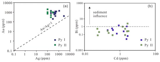 The Fe atomic percent values of hexagonal pyrrhotite and monoclinic pyrrhotite are 47.0–47.8 at.% and 46.5–47.0 at.%, respectively []. These data indicate that the pyrrhotite in the Dongguashan deposit mainly contains hexagonal and monoclinic pyrrhotite. The Fe atomic percent and content of pyrrhotite reach up to 48.35 at.% and 60.64 wt.% in the sample DGS 5-9 (collected in the stratiform orebody), respectively, which is similar to the composition of pyrrhotite in the corresponding mantle inclusion []. Using the T-x (Fe) imitative straight-line equation of y = −201.22x + 9854.32 (y is the temperature, x is the Fe atomic percent []), the crystallization temperatures of monoclinic pyrrhotite were calculated. The results show that the crystallization temperatures of monoclinic pyrrhotite range from 286 to 387 °C, with an average value of 353 °C, indicating that different pyrrhotites formed in a medium- to high-temperature environment. In general, the Co contents of high-temperature pyrite, medium-temperature pyrite and low-temperature pyrite are >1000 ppm, 100–1000 ppm and <100 ppm, respectively []. The larger value of the Co/Ni implies the higher temperature of pyrite formation []. The Co contents of Py I and Py II are 0.009–0.96 wt.% (90–9600 ppm) and 0.02–0.45 wt.% (200–4500 ppm), with corresponding average values of 0.21 wt.% (2100 ppm) and 0.16 wt.% (1600 ppm), respectively (Appendix A). This supports the conclusions that Py I and Py II were formed in medium- and high-temperature environments. Arsenic can replace S isomorphically in pyrite, and As tends to be enriched in low-temperature systems []. Most of the As contents of Py I and Py II are below the detection limit, indicating that the ore-forming system is a high-temperature system. Moreover, Py I and Py II have high Au/Ag ratios (most >1, Figure 7a, Appendix A), which are different from those of sedimentary/diagenetic pyrite [,], reflecting that the Dongguashan copper (gold) deposit has a medium- to high-temperature hydrothermal genesis []. Py I and Py II are depleted in Ni, As, Pb, Te and Sb, which are different from those of synsedimentary pyrite [], according to the geochemical characteristics of the high temperature hydrothermal pyrite []. The higher contents of Mn, Cu, Se and Zn show some similarity with the skarn deposit [].