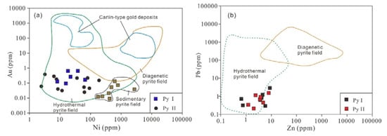 Ni vs. Au diagram (a) and Zn vs. Pb diagram (b) for pyrite from massive and lamellar ores of the Dongguashan copper (gold) deposit (after Reference []). Data of sedimentary pyrite are from Reference [].