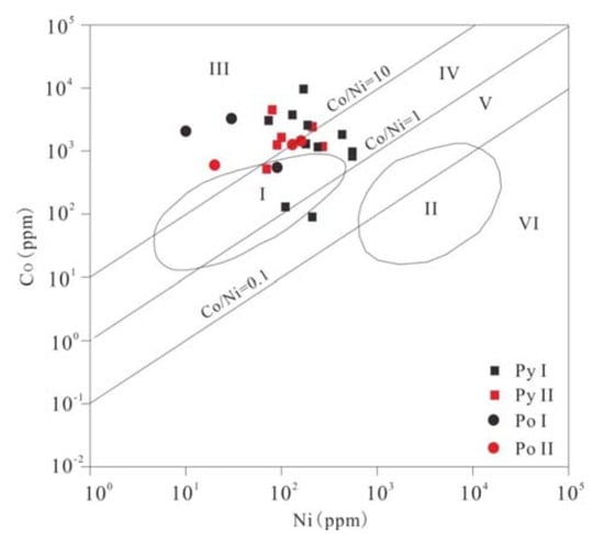 Ni vs. Co diagrams for pyrite and pyrrhotite from massive and lamellar ores of the Dongguashan copper (gold) deposit (References [,]). I: deposit related to magmatic–hydrothermal solutions; II: Cu–Ni sulfide deposit; III, IV: magmatic and hydrothermal fields; V, VI: sedimentary and sedimentary-reformed field (Note: I, II stand for the data of pyrrhotite; III-VI regions stand for the data of pyrite).