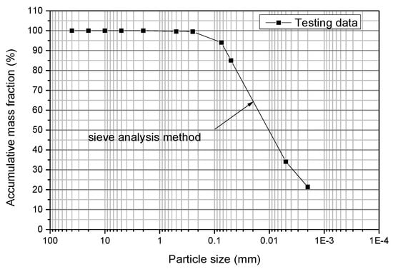 Many researchers observed the important effects of physical and chemical properties of tailings on the strength and fluidity. Particle size and chemical composition were the most influential parameters affecting the properties of CPB. In this study, the particle size is measured by the sieve analysis method (SAM). The results of the particle size distribution are shown in Table 1 and Figure 1. It may be seen that particles with a size less than 0.002 mm comprise 21.4% and particles with a size less than 0.05 mm comprise 84.0%. The parameter d50, which means the median particle size, defined by the particle size when the accumulative percentage reaches 50%, can be calculated from Figure 1. By Figure 1, d50 is 0.012.