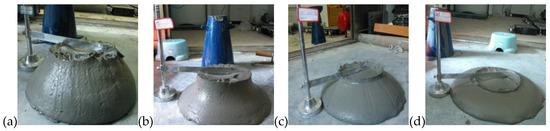 Slump tests of CPB mixture with different polynaphtalene sulfonate dosage: (a) 0, (b) 0.2%, (c) 0.4%, and (d) 0.8%.