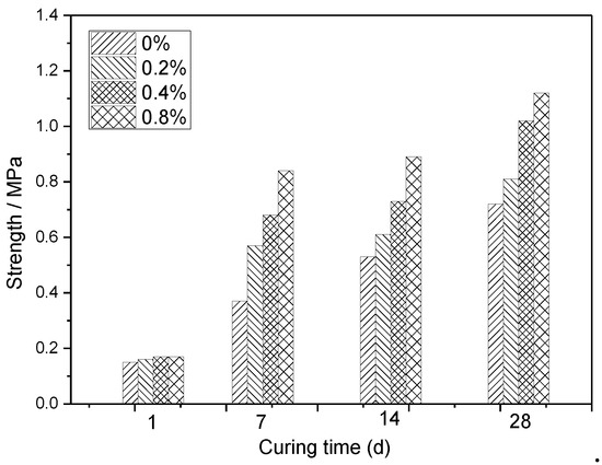 The correlation between the strength of CPB and dosage of polynaphtalene sulfonate is shown in Figure 5. It shows that the strength of CPB increases with the increase of curing time. Additionally, with the increased dosage of polynaphtalene sulfonate, the 1 d strength remained nearly constant. However, the 7 d, 14 d, and 28 d strengths increase rapidly with an increase in polynaphtalene sulfonate dosage. This means that the polynaphtalene sulfonate has a negligible effect on the 1 d strength of CPB, while it has a positive effect on the 7 d, 14 d, and 28 d strength gain.