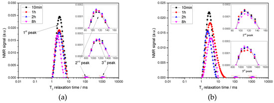 The T2 relaxation time of short-duration (10 min–8 h) hydration of CPB mixture is shown in Figure 6 and Figure 7. It can be seen that the T2 relaxation time curve has three peaks, indicating three main water phase states. The three peaks, which are shown in Figure 6a, are named here from left to right as the 1st peak, the 2nd peak, and the 3rd peak. It demonstrated that the centre of the 1st peak is 1 ms–10 ms, while the centre of the 2nd and the 3rd peaks are about 100 ms and 1000 ms, respectively. Thus, it can be judged that the 1st peak is the signal of bonded water in the gel phase, while the 2nd and the 3rd peaks are the signals of pore water and free water, respectively. Figure 6 demonstrated that the peak value of the 1st peak decreased with an increase in hydration time, which means that the amount of the bonded water in the gel phase decreased. The decrease in bonded water in the gel phase is mainly due to the reaction with the binder, leading to the decreasing of a detectable water molecule. Additionally, it can be seen that the 2nd and the 3rd peaks do not change much, identifying that the amount of pore water and free water changes little during the short-duration hydration. In addition, it is implied that during the hydration time of 10 min to 1 h, the peak value of the 1st peak decreases more than during 1 h–8 h. This is mainly because during the hydration process of CPB mixture the reaction between water and binder is stronger in the first 30 min [22].