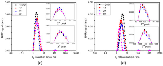 The short-duration T2 relaxation time of the CPB mixture with different hydration times when polynaphtalene sulfonate dosage is: (a) 0%, (b) 0.2%, (c) 0.4%, and (d) 0.8%.
