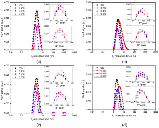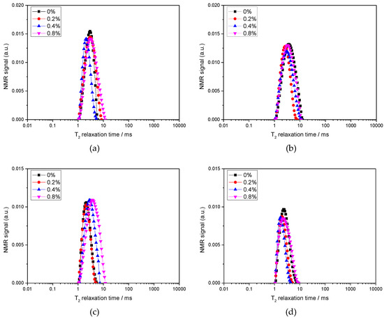 The short-duration T2 relaxation time of CPB mixture with different polynaphtalene sulfonate dosages when the hydration time is: (a) 10 min, (b) 1 h, (c) 2 h, and (d) 8 h.