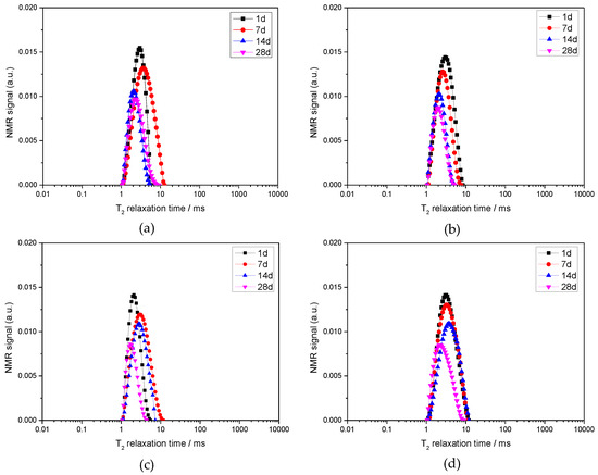 The T2 relaxation time of long-duration (1 d–28 d) hydration is shown in Figure 8 and Figure 9. Figure 8 presents that, similar to Figure 6, the peak value of the 1st peak decreased with an increase in curing time, which demonstrated that the amount of bonded water in the gel phase decreased. In addition, there is only one peak of the long-duration T2 relaxation time curve, identifying that during the hydration time 1 d–28 d, there is almost no pore water and free water in the CPB specimens. On the other hand, as presented in Figure 9, during long-duration hydration, the peak values of the 1st peak showed no conclusive trend with the increased dosage of polynaphtalene sulfonate. This result further demonstrated that the polynaphtalene sulfonate has a stronger influence on the short-duration hydration than the long-duration hydration. This has been explained in the next part.