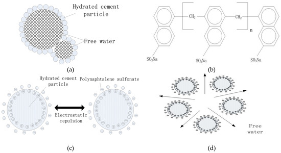 Physico-chemical mechanism of the effect of polynaphtalene sulfonate on the consistency of CPB: (a) flocculent structure, (b) chemical structure of polynaphtalene sulfonate, (c) electrostatic repulsion effect and (d) destruction of the flocculent structure.