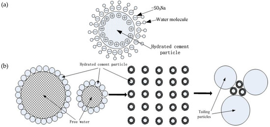 Physico-chemical mechanism of the effect of polynaphtalene sulfonate on the strength of CPB: (a) adsorption effect and (b) filling effect.