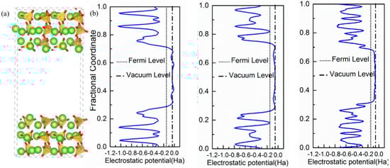 (a) Atomic representation of the β-C2S (100) surface model visualized with VESTA []. Red, green, and orange spheres represent oxygen, calcium, and silicate atoms, respectively. The SiO4−4 groups are further represented as orange tetrahedral. (b) Electrostatic potentials along with the vertical vectors of the slab for the (100), (101), and (010) cleavage directions. The solid line represents the vacuum level.
