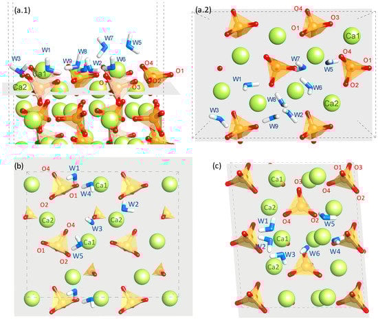 (a) Water adsorption configurations on β-C2S (100) in side (a.1) and top (a.2) views. For the β-C2S (101) (b) and (010) (c), only the top view is shown. The nomenclature of the Ca and O sites from dicalcium silicate follow that of the original paper describing the crystalline structure []. The atoms representation is the same as in Figure 1 including the water molecules with the O atoms in blue and the H atoms in white. It must be noted that the conformation sites labelled as W2 and W4 in the (100) were different in the empirical simulation. However, after the present DFT energy minimization, they became equivalent.