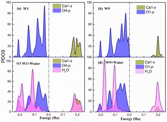(a,b) The partial density of states of W1 and W9 adsorption sites on the relaxed surface (c,d). The partial density of states of W1 and W9 adsorption sites after water adsorbed on the surface. The dash dot line indicates the Fermi level. Note that Ca1 in sites W1 and W9 were equivalent in the bulk. However, after slab relaxation, they are not equivalent and hence have different PDOS.