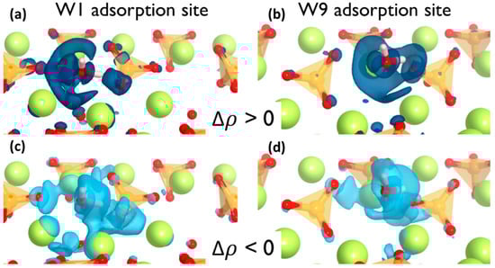 Isosurface plots of the electron density difference for W1 (a,c) and W9 (b,d) adsorption sites. Dark and light blue isosurfaces indicate the electron density surfeit and depletion, respectively.