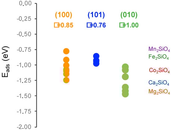 The adsorption energies can be compared with those reported by DFT for the olivine family of orthosilicates by Kerisit et al. [], see Figure 5. These results correspond to the adsorption energy of a single water molecule adsorption per unit cell in two configurations, flat and side, always in the (010) surface. For the olivine family, different adsorption energies were found depending on the cation increase following the series Mn < Fe < Co < Ca ≈ Mg. First, it must be pointed out that the DFT adsorption energies from Kerisit et al. do not follow the same trend as the experimental dissolution rates [], which suggests that water adsorption energies are just a small portion of the complex process that is dissolution. Second, it is clear that our results are in the same range of other orthosilicates. It is noteworthy that calcium olivine is the one with a larger difference of adsorption energies, which is consistent with the dispersion that we found in our study. Lastly, it must be noted that the comparison with olivines is very relevant from the cement perspective because calcium olivine mineral is the γ-polymorph of belite, which is a phase that is avoided in cement production due to its negligible reactivity. Comparing our results with those of Kerisit, it seems that the γ-polymorph presents larger water adsorption energies than the β-polymorph. This is a counterintuitive result that was previously reported in Reference [] because the experimental dissolution rate of β-C2S is larger than that of γ-C2S.