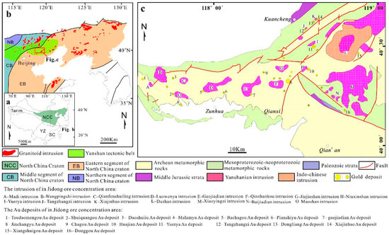 Simplified geological maps: (a) Major tectonic divisions of China; (b) Sketch map showing distribution of the Triassic to Jurassic granitic intrusions in the eastern NCC; (c) Simplified geological map of eastern Hebei Province (Modified from Mei [4] and Song et al. [5]).