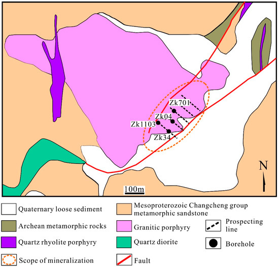 The Lamagou Formation of the Xiajinbao Group contains the oldest strata in the Xiajinbao area. Its orogenesis mainly intruded into Archean–Jurassic strata, which are distributed along SE–NW direction, with an outcropping area of 0.35 km2. These rocks show porphyritic and massive structures. The major ore minerals mainly intruded into the Archean–Jurassic strata. The phenocrysts are mainly quartz, K-feldspar, and minor plagioclase. The matrix consists mainly of micro–fine K-feldspar and quartz. The K-feldspar content in the rock ranges from 35% to 40%. The phenocrysts are mainly hypidiomorphic in form. The accessory minerals include zircon and apatite. The plagioclase content in the rock is approximately 30%. Plagioclase phenocrysts mainly occur as hypidiomorphic platy crystals, with developed polysynthetic and Carlsbad twinning, together with sericite and kaolinite. The accessory minerals commonly exhibit a certain degree of sericitization. Quartz represents 25–30% of the rock and fills the spaces between other mineral grains in the form of xenomorphic grains with diameters ranging from 0.2 to 2 mm. Biotite comprises approximately 3% of the total rock. The total content of the remaining minerals is less than 2%.