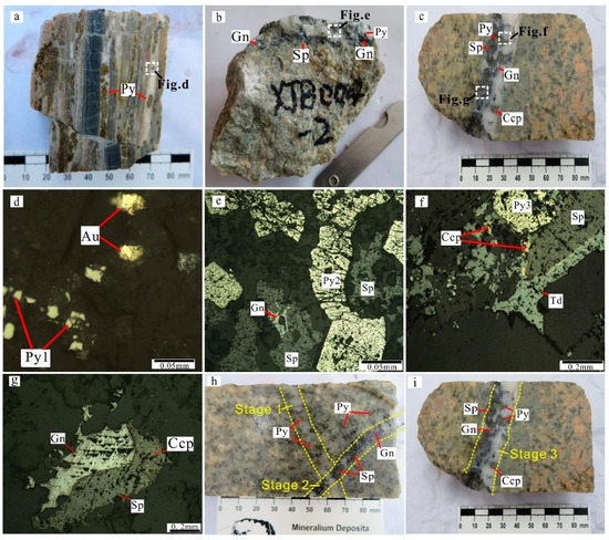 Mineral assemblages of the Xiajinbao deposit. (a) Banded auriferous pyrite–quartz vein type ores; (b) Galena–sphalerite–quartz vein-bearing altered granitic porphyry; (c) Multi–sulfide (pyrite, chalcopyrite, tetrahedrite, galena, sphalerite)–quartz-bearing altered granitic porphyry; (d) Native–gold–pyrite-bearing quartz vein; (e) Sphalerite replacing hypidiomorphic–allotriomorphic pyrite and replaced by galena; (f) Sphalerite replacing hypidiomorphic–allotrimorphic pyrite, chalcopyrite replacing pyrite and sphalerite, tetrahedrite replacing sphalerite, and chalcopyrite; (g) Common crystallization texture between galena and sphalerite; (h) Galena–sphalerite–quartz vein cutting through pyrite–quartz vein; (i) Multi–sulfides (pyrite, chalcopyrite, tetrahedrite, galena, sphalerite)–quartz vein. Py—pyrite; Ccp—chalcopyrite; Gn—galena; Sp—sphalerite; Td—tetrahedrite; Bi—bismuth.