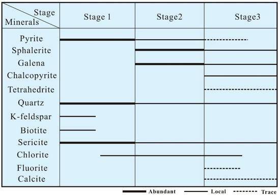 Based on studies regarding the intersecting relationships among the ore-bearing veins and the paragenetic relations among the minerals, the metallogenic process can be divided into three stages: quartz–pyrite stage (Stage 1); quartz–galena–sphalerite stage (stage 2); and the quartz polymetallic sulfides (pyrite, chalcopyrite, galena, sphalerite, and tetrahedrite) stage (Figure 4h,i). A paragenetic diagram is provided for the Xiajinbao ores in Figure 5.
