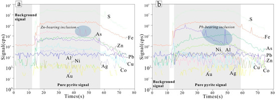 There is a positive correlation between Fe and Pb, and a positive correlation was also observed between Fe and Cu in pyrite from different mineralization stages (Figure 8g,h). Lead is least likely to be incorporated into the pyrite crystal lattice due to its ionic size [13]. It has a faster precipitation rate from an aqueous solution as a metal sulfide when compared to Fe [31,32]. Thus, Pb forms galena prior to pyrite formation, such that galena inclusions are commonly found in pyrite. Several analytical spots with higher levels of Pb than in other pyrite samples from different mineralization stages support this interpretation (Table 4). Similarly, high Cu and Zn concentrations probably result from inclusions of chalcopyrite and sphalerite, respectively. Furthermore, micro-inclusions in pyrite may influence the bulk pyrite geochemistry that was detected (Table 4). The few anomalously high Cu, Pb, and Zn analyses in pyrite may result from the presence of Cu-bearing phases, Pb-bearing phases (galena inclusions), and Zn-bearing phases (sphalerite inclusions) (Figure 9). LA-ICPMS data indicates that the Bi content is low in pyrite (0.01–1.39 ppm), with only one exception (360 ppm). During LA-ICPMS analysis, the Bi ion signal is essentially non-detectable. However, visible Bi-bearing minerals are found under reflected-light microscopy (Figure 6c). The anomalously high Bi and Pb values may be attributed to Bi- or Pb–Bi-bearing inclusions (Bi-bearing galena) within the pyrite.