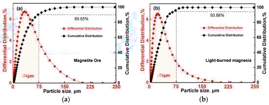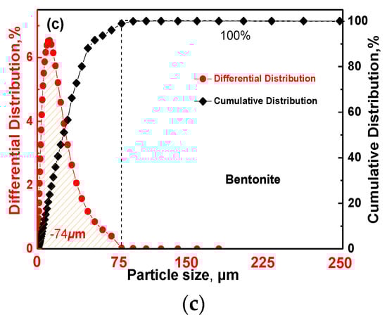The particle size of the pelletizing materials was analyzed using the MASTERSIZER2000 laser particle size analyzer (Malvern Instruments, Malvern, UK) seen in Figure 1. At present, there is no explicit ISO standard about the particle size of iron ore for pelletizing. In the national standard of China [], it is required that portion of the particles size less than 74 μm (−74 μm) should overtop 80%. From Figure 1, the particle size of the pelletizing materials is fine enough to meet pelletizing demands.