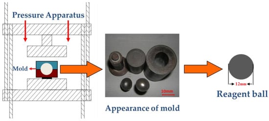 (1) Preparing of the reagent ball. The reagent ball was prepared via pressing equipment (Q-500, Shenyang Metals Equipment, Shenyang, China). Generally, the desired MgO dosage in pellet production should not be too high so that the pellet can maintain a higher iron grade. Therefore, three kinds of reagent ball including base reagent ball (w(Fe3O4) = 100%), 2.5% MgO bearing reagent ball (w(Fe3O4)/w(MgO) = 97.5%/2.5%), and 5.0% MgO bearing reagent ball (w(Fe3O4)/w(MgO) = 95.0%/5.0%) were designed to contrastively clarify the effect of MgO on the oxidation of Fe3O4. A general view of the pressing reagent ball process is shown in Figure 2. The diameter of the reagent sample is 12 mm and the weight of per reagent ball is 6 ± 0.2 g.
