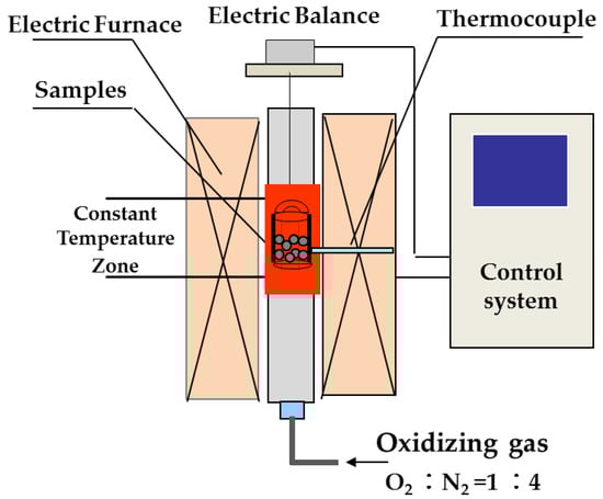 (2) Firing of the reagent ball. The reagent ball was fired at oxidizing atmosphere to simulate the induration process of pellet. The schematic drawing of equipment is shown in Figure 3. Electric balance (ME204, Mettler Toledo, Zurich, Switzerland) was used to record the weight increment of reagent ball in firing process. The relation between oxidation ratio of Fe3O4 (Y) and time (t) was then plotted. The detailed experimental conditions are shown as follows. Firing temperature: 1250 °C; weight of total samples: 120 ± 4 g (Totally, 20 reagent balls were adopted); Accuracy of balance: 0.0001 g; oxidizing gas flow (O2:N2 = 1:4): 15 L/min.