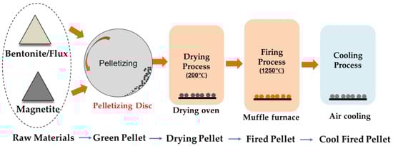 - Producing green pellet. The main parameters in this step include, 8.0 ± 0.5% of moisture content in mixed raw materials, 30 min of pelletizing time, and 12.0 mm of size for the green pellet;