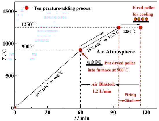 - Firing of the green pellet. In order to physically simulate the firing process of grate-rotary kiln in pellet plants, the dried pellet is put into a preheated muffle furnace (MF400, Great Wall Electronic Furnace, Shenyang, China) at 900 °C, and then the temperature of furnace is increased to 1250 °C and finally maintains at 1250 °C for 20 min. In addition, the air is blasted into the furnace in 1.2 L/min after the dried pellet is put in the furnace. The details of firing process are shown in Figure 5;