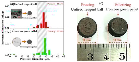 The porosity and pore distribution for both the unfired reagent ball and the iron ore green pellet were contrastively tested to determine the pressure condition of preparing the reagent ball. The pore parameters and cross section images of two kinds of samples are shown in Figure 6. It is worthwhile mentioning that each result of porosity in Figure 6a,b is repeated twice. The arithmetic mean of the two results is used as the final result. The results in Figure 6a,b indicate that as the pressure of preparing reagent ball is confirmed at 10 MPa for keeping 2 min, the pore distribution and porosity between the unfired reagent ball and iron ore green pellet appears similar. One can also conclude from Figure 6c that the cross sections of both the unfired reagent ball and the iron ore green pellet are of similarity. It is consequently deemed that the reagent ball can well represent the iron ore pellet due to similar dynamic conditions (pore conditions). The oxidation experiment results of reagent ball are suitable to be referenced for iron ore pellet. In the study, we also pick up the conclusion that the porosity and pore distribution of all sorts of the green pellet (different light-burned magnesia dosage) are similar if the pelletizing materials (especially for iron ore and bentonite) are stable and the preparing green pellet parameters are the same.